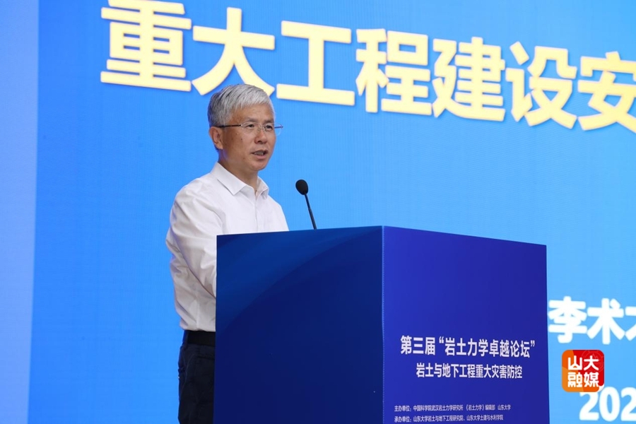 李术才作题为“重大工程建设安全防控与高效掘进”的主题报告。他面向国家重大需求和国际前沿科学问题,结合国家重大工程中的灾害预报和治理实践,从隧道不良地质超前预报理论与技术,突水突泥治理方法、材料与成套技术,隧道与地下工程高效掘进技术及装备等方面,深入介绍了地下工程灾害防控中的新思想、新方法、新材料、新工艺、新装备,呼吁广大岩土工程领域科技工作者服务国家战略,勇攀科技高峰,为实现高水平科技自立自强作出新的贡献。